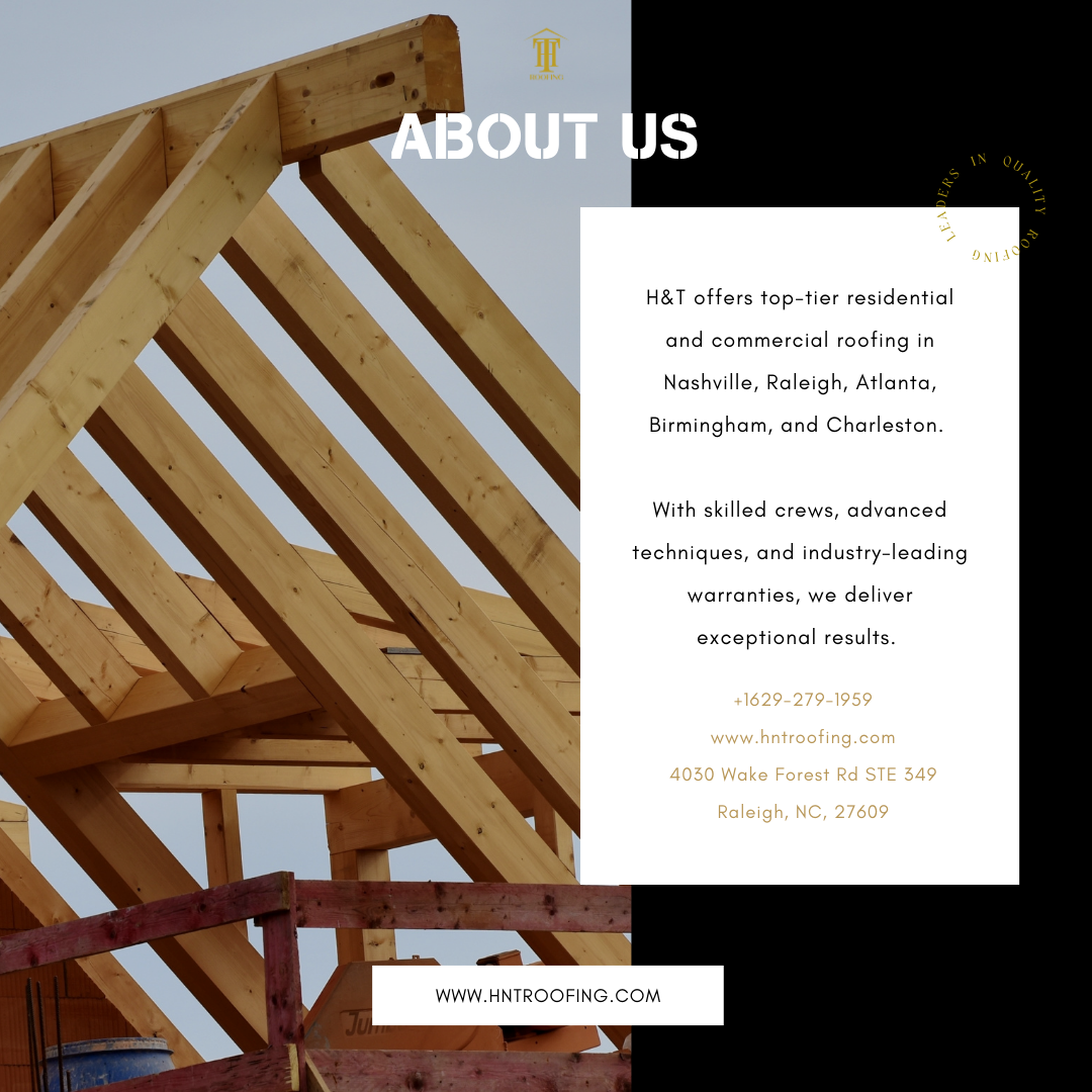 H&T Roofing is a trusted roofing and reconstruction company serving the Southeast, with strong local presence in Nashville, Raleigh, Atlanta, Birmingham, and Charleston. Known for their commitment to quality and reliability, H&T Roofing delivers top-tier residential and commercial roofing services, traveling throughout the region with dedicated crews.